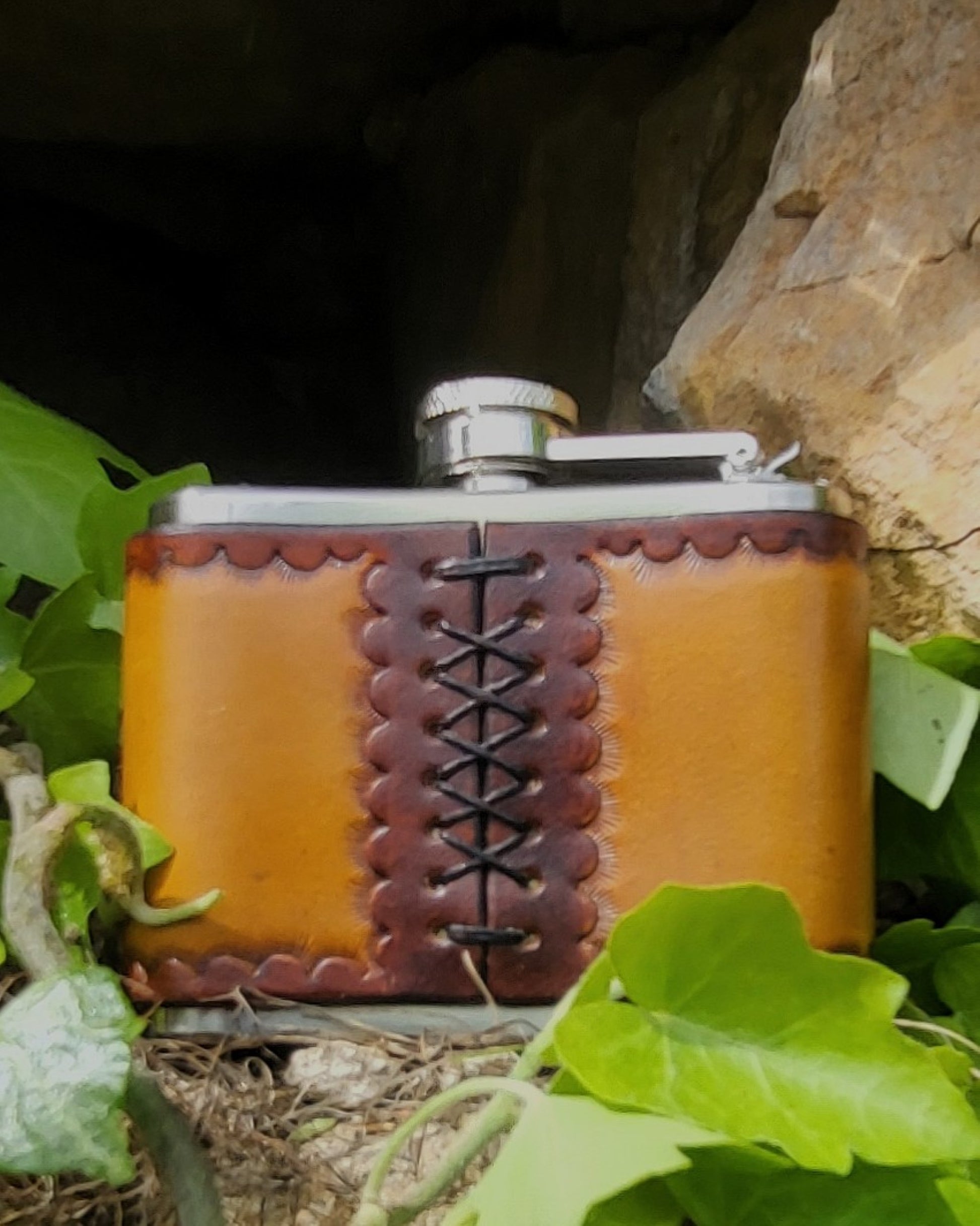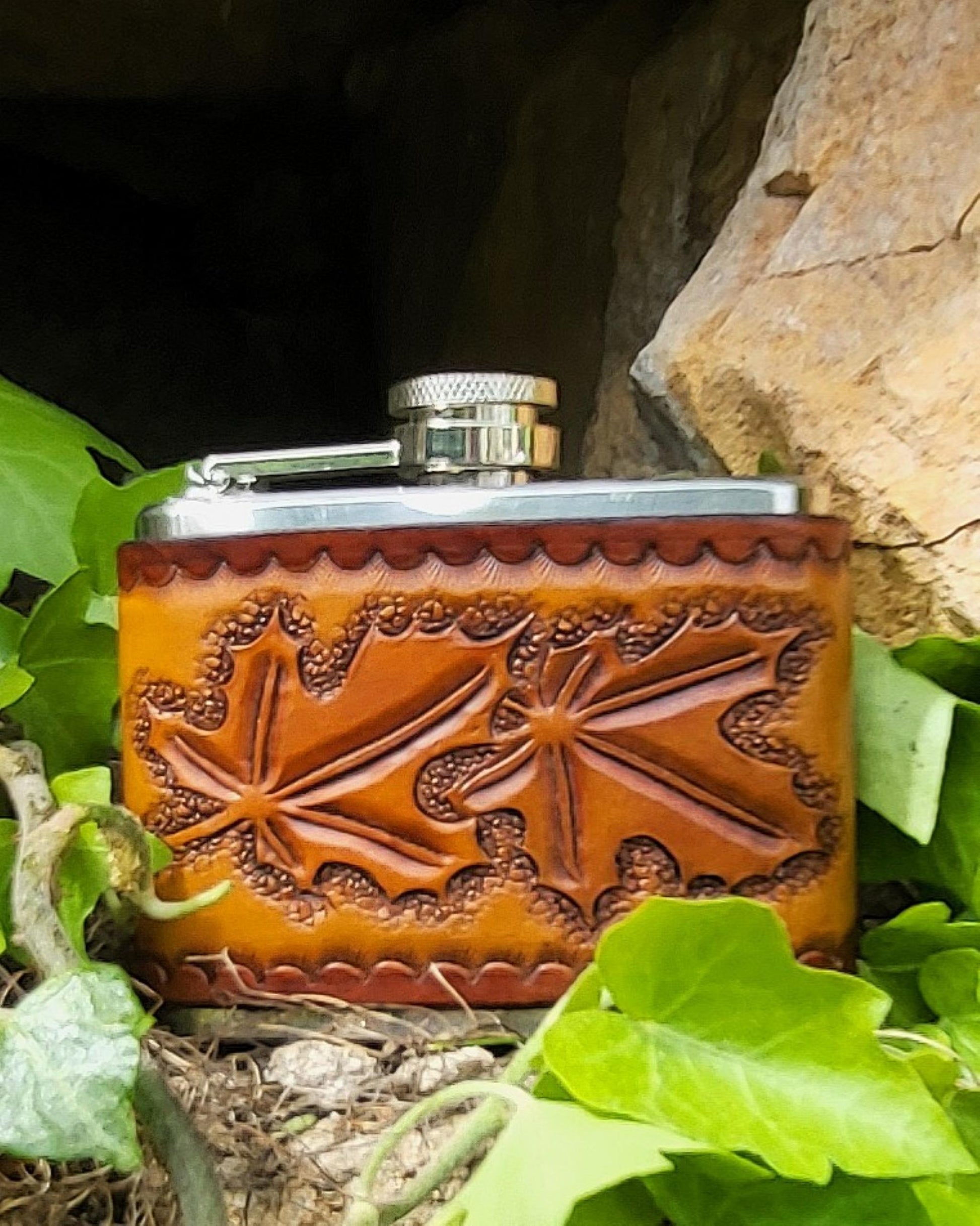 Edelstahl-Flachmann mit handgefertigtem Ledereinband, geziert von Ahornblättern
