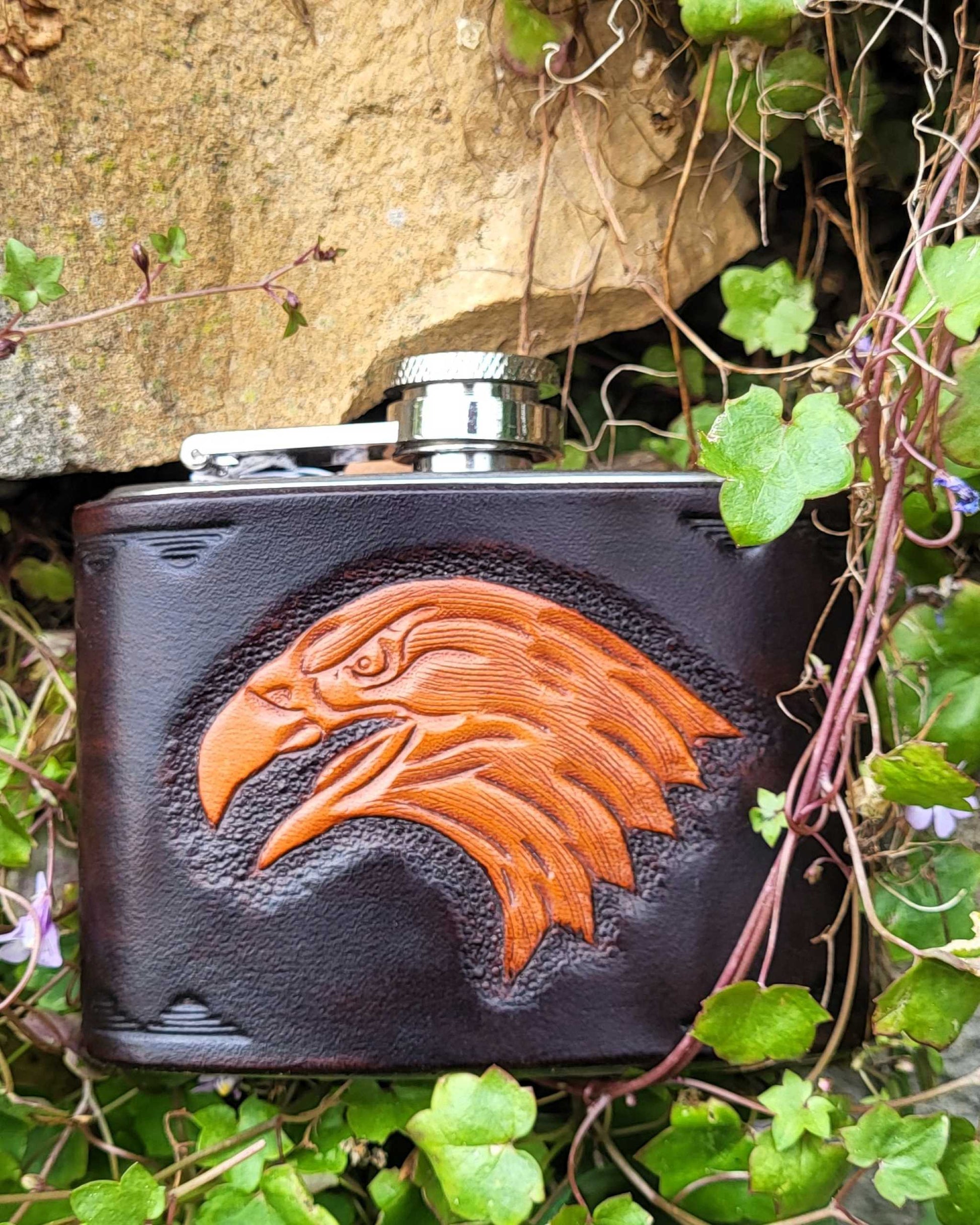 Edelstahl-Flachmann mit handgefertigtem Ledereinband, geziert von einem Adlerkopf