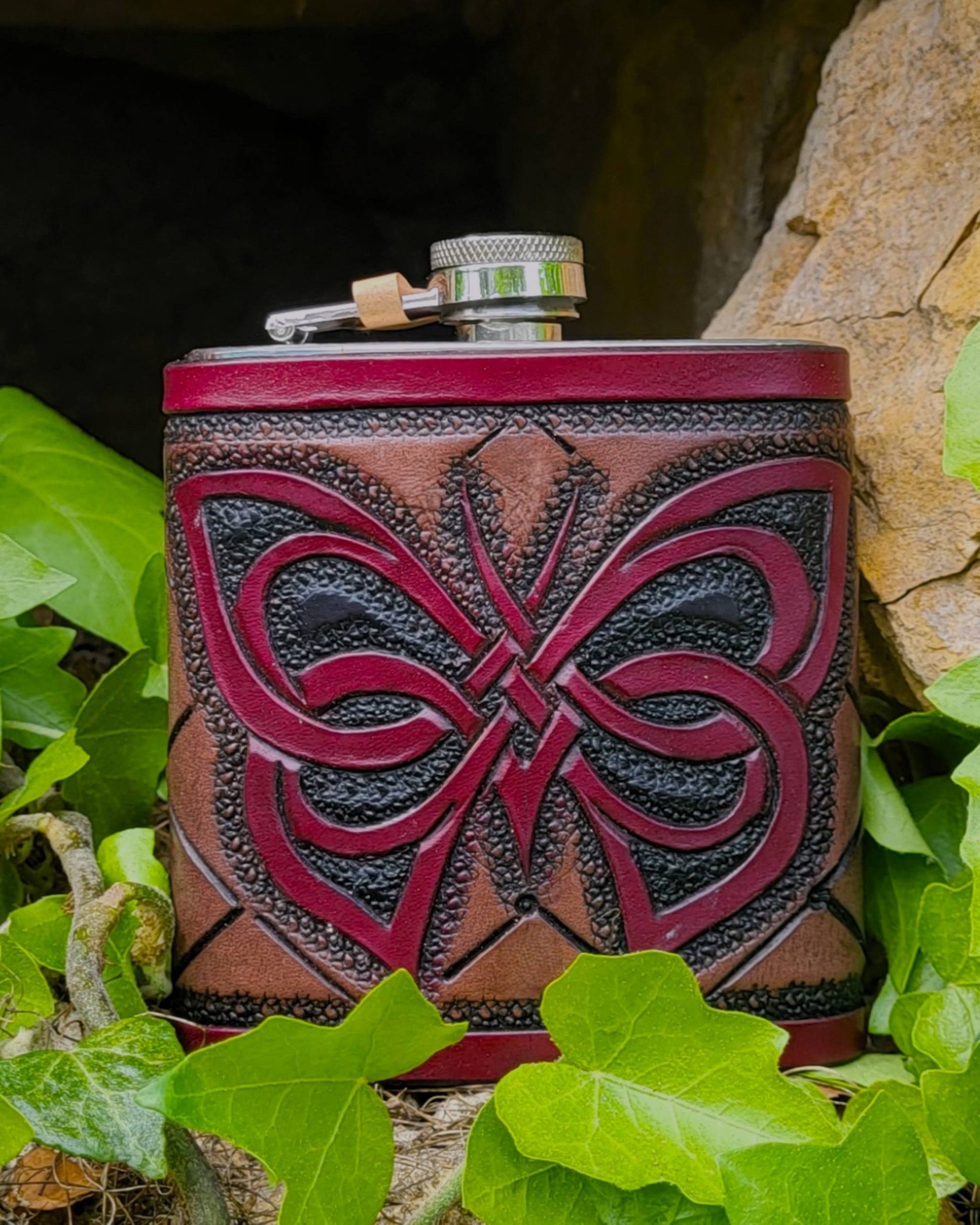 Edelstahl-Flachmann mit handgefertigtem Ledereinband, geziert von einem Schmetterling
