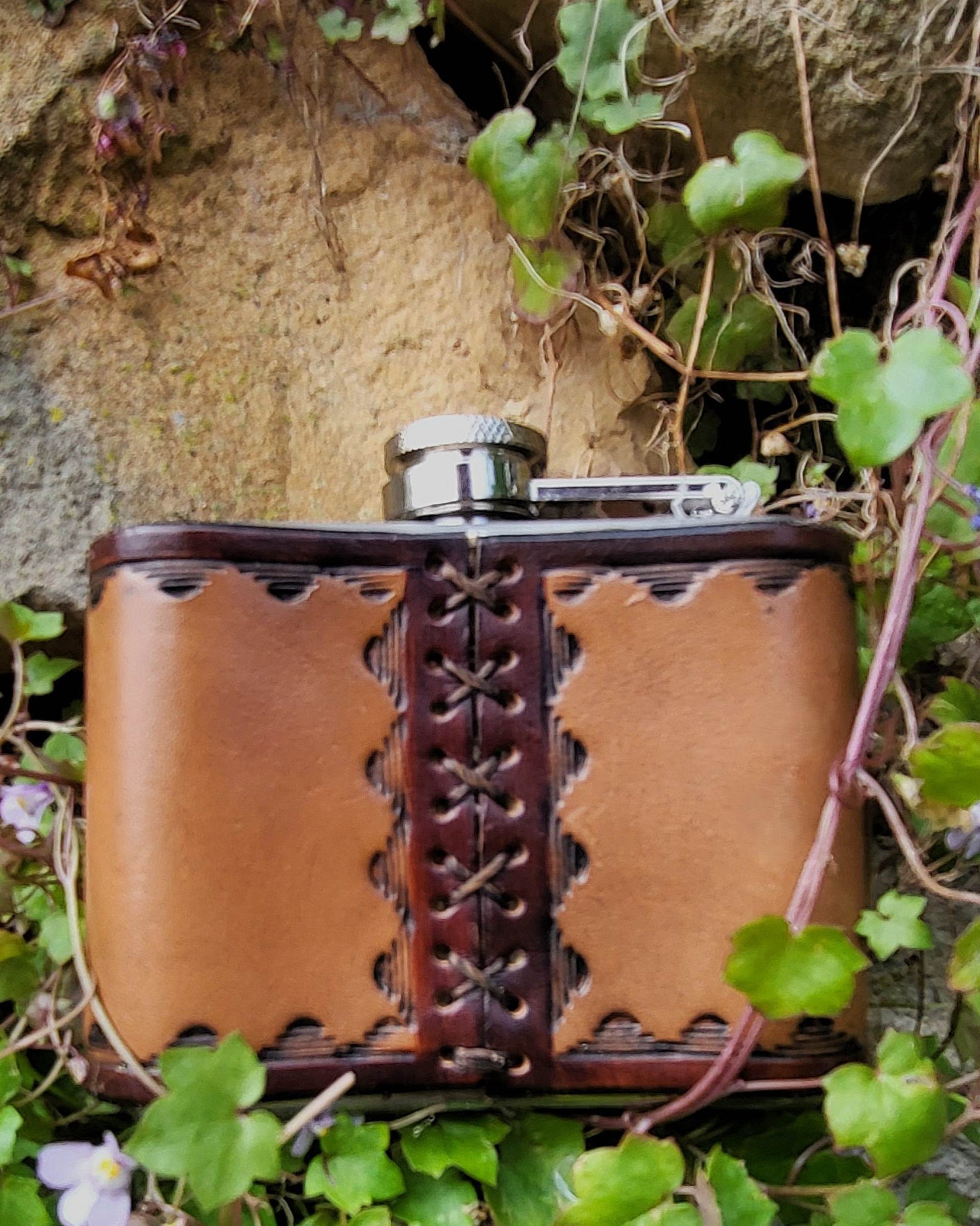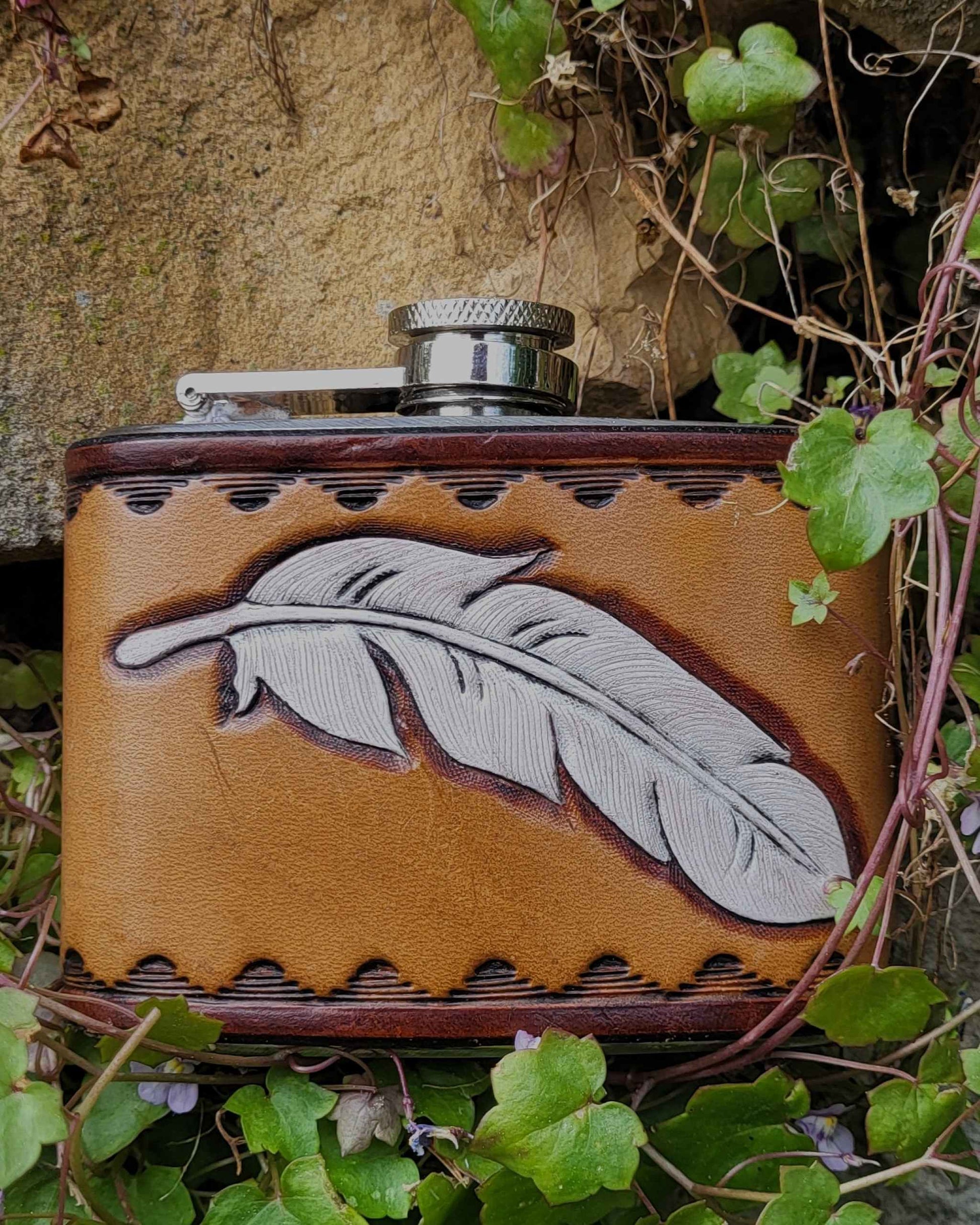 Edelstahl-Flachmann mit handgefertigtem Ledereinband, geziert von einer Feder