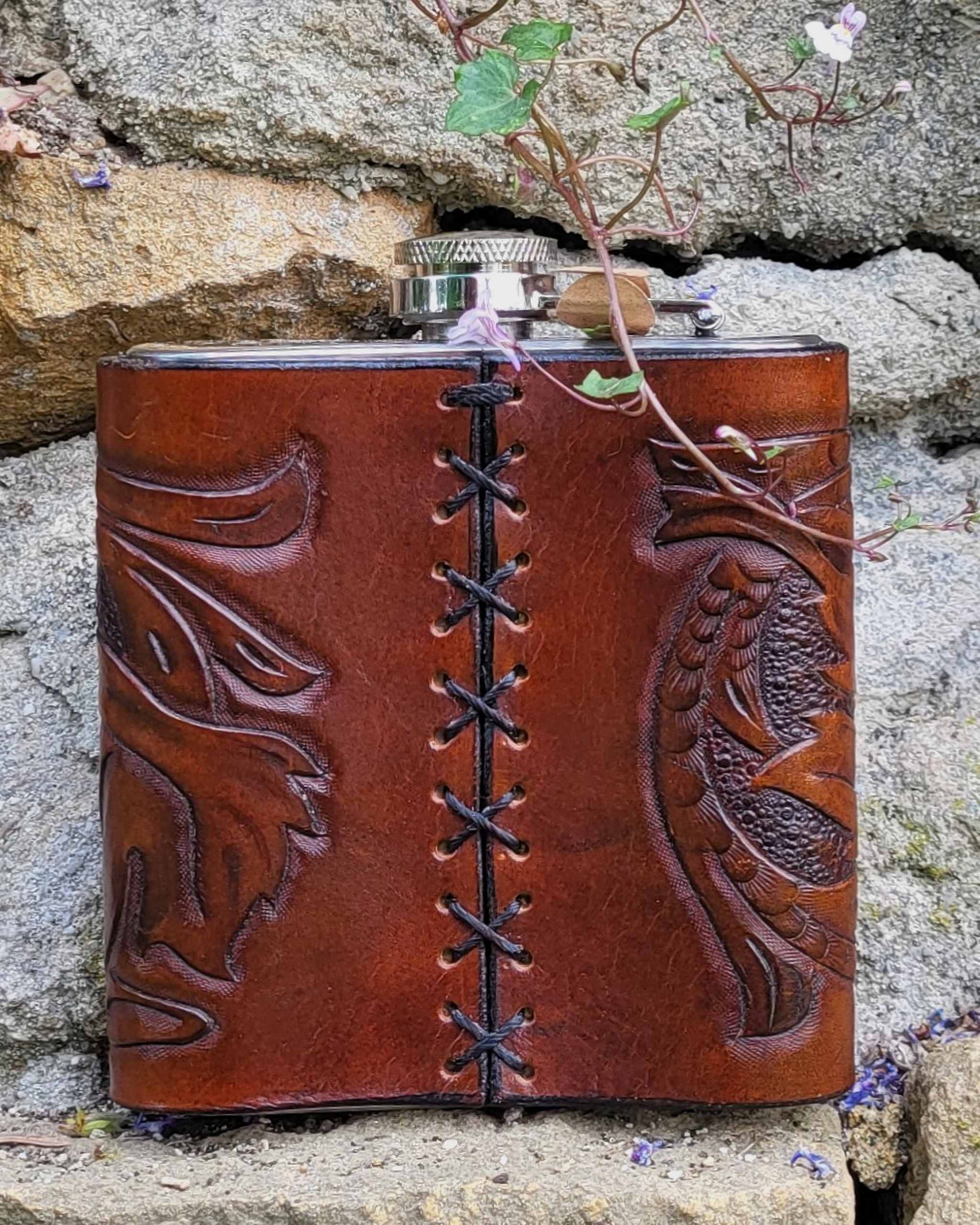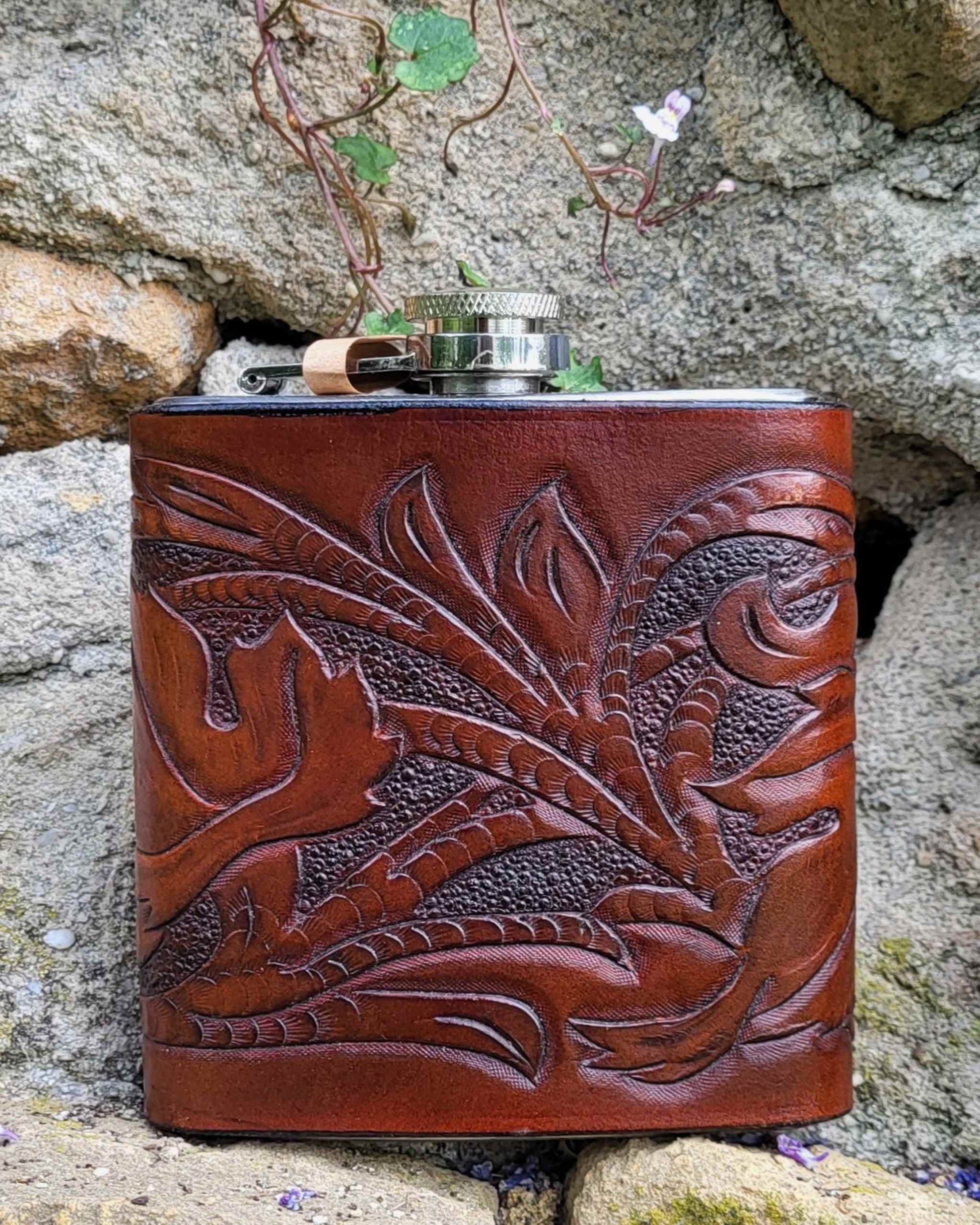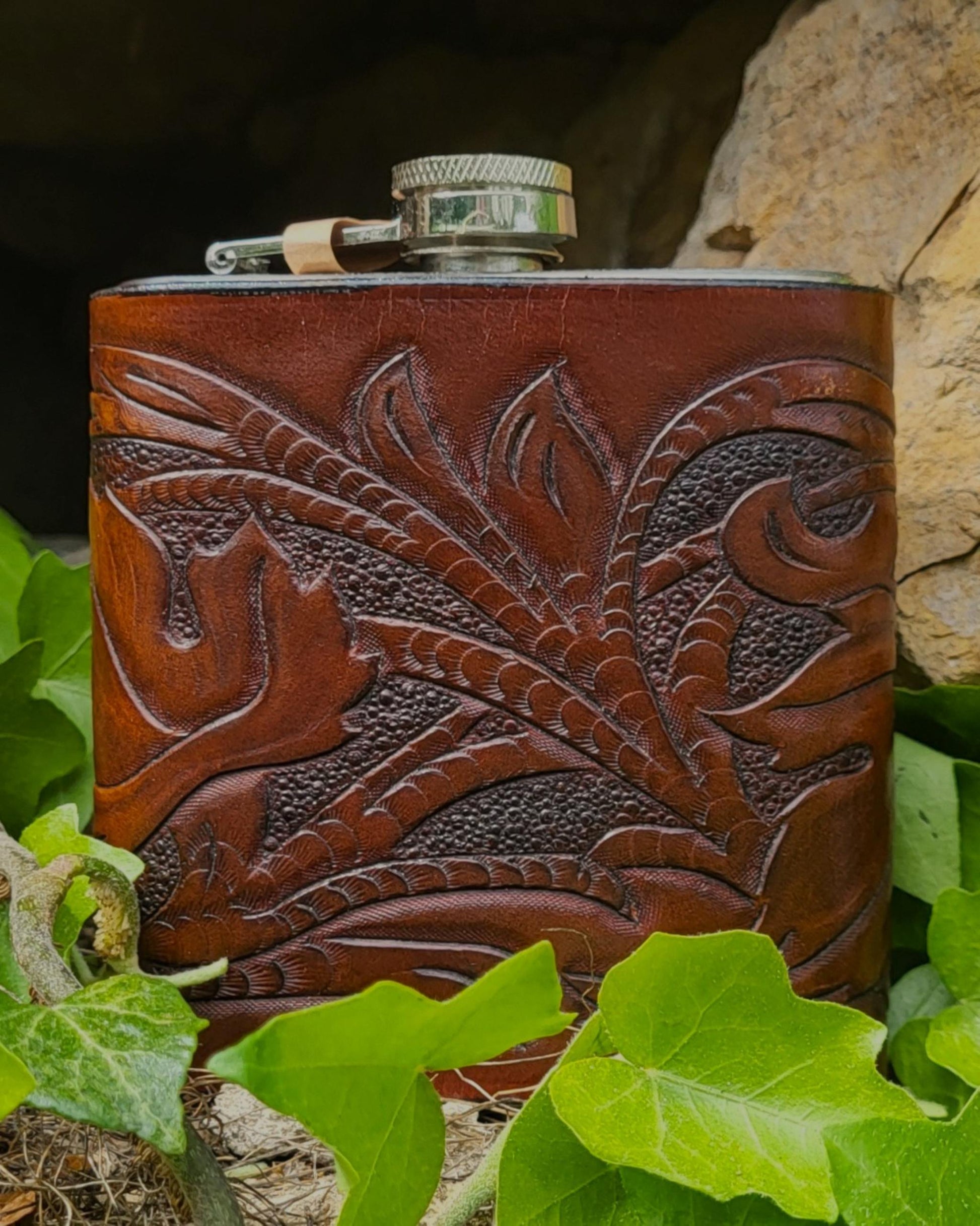 Edelstahl-Flachmann mit handgefertigtem Ledereinband, geziert von rankenden Weinblättern
