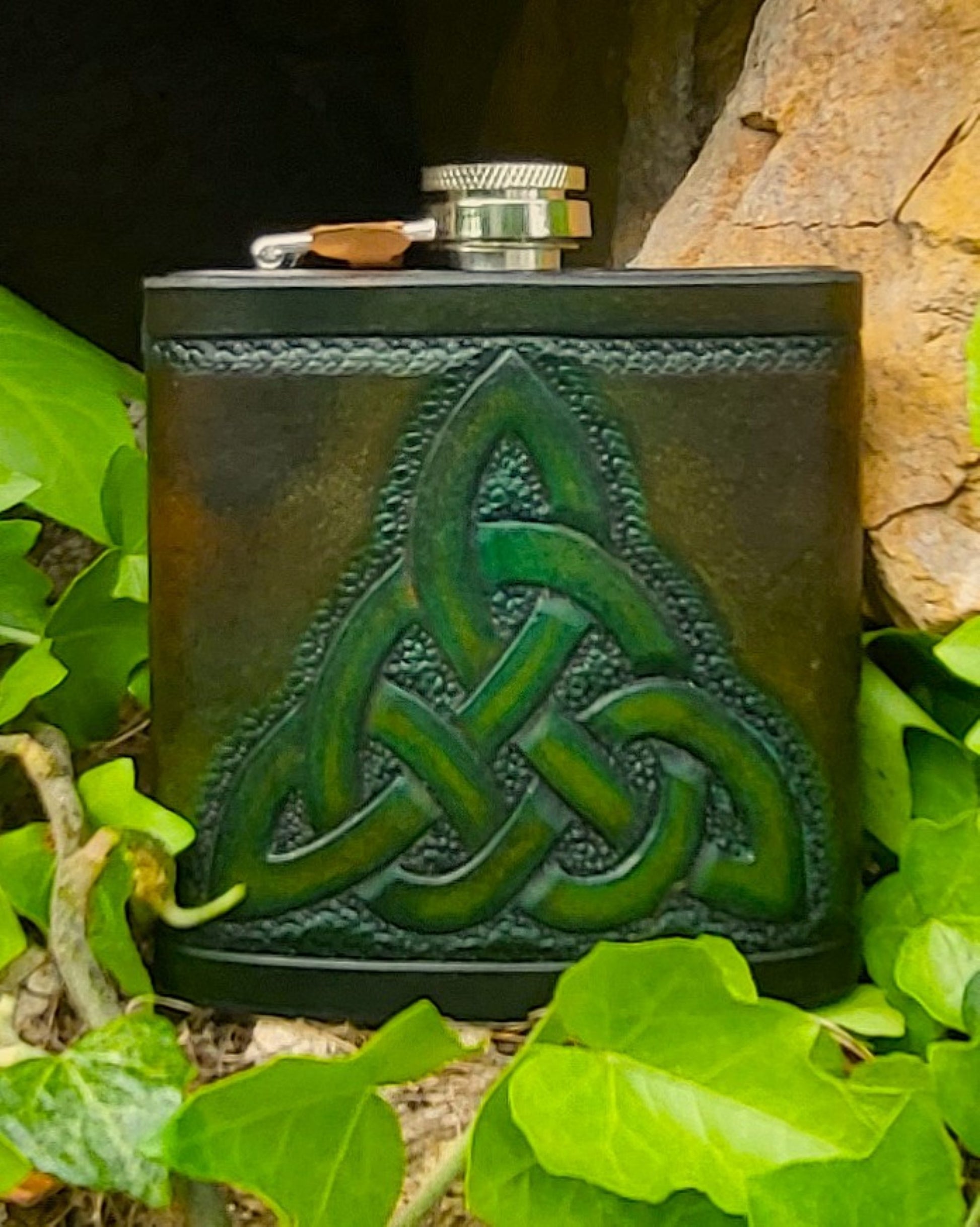 Edelstahl-Flachmann mit handgefertigtem Ledereinband, geziert von einem keltischen Knoten