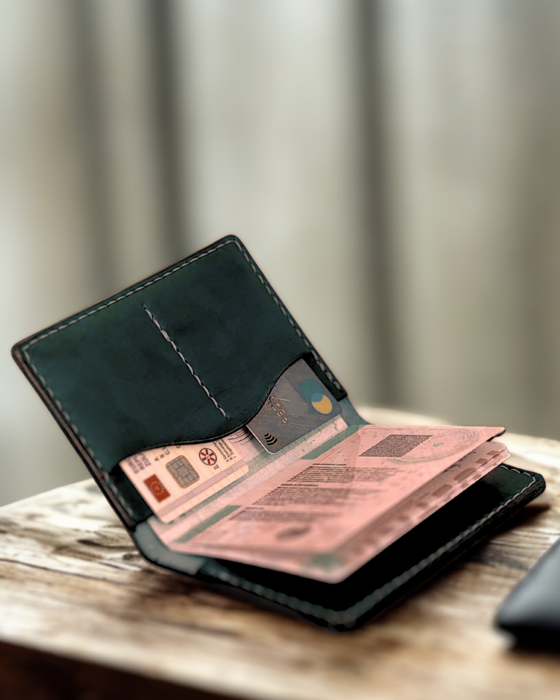 Im Inneren der Hülle befinden sich kleine Fächer, in denen Karten verstaut werden können z. Kreditkarte, Führerschein usw..) Das Leder ist robust und elegant, gleichzeitig praktisch für die sichere Aufbewahrung von Reisedokumenten.