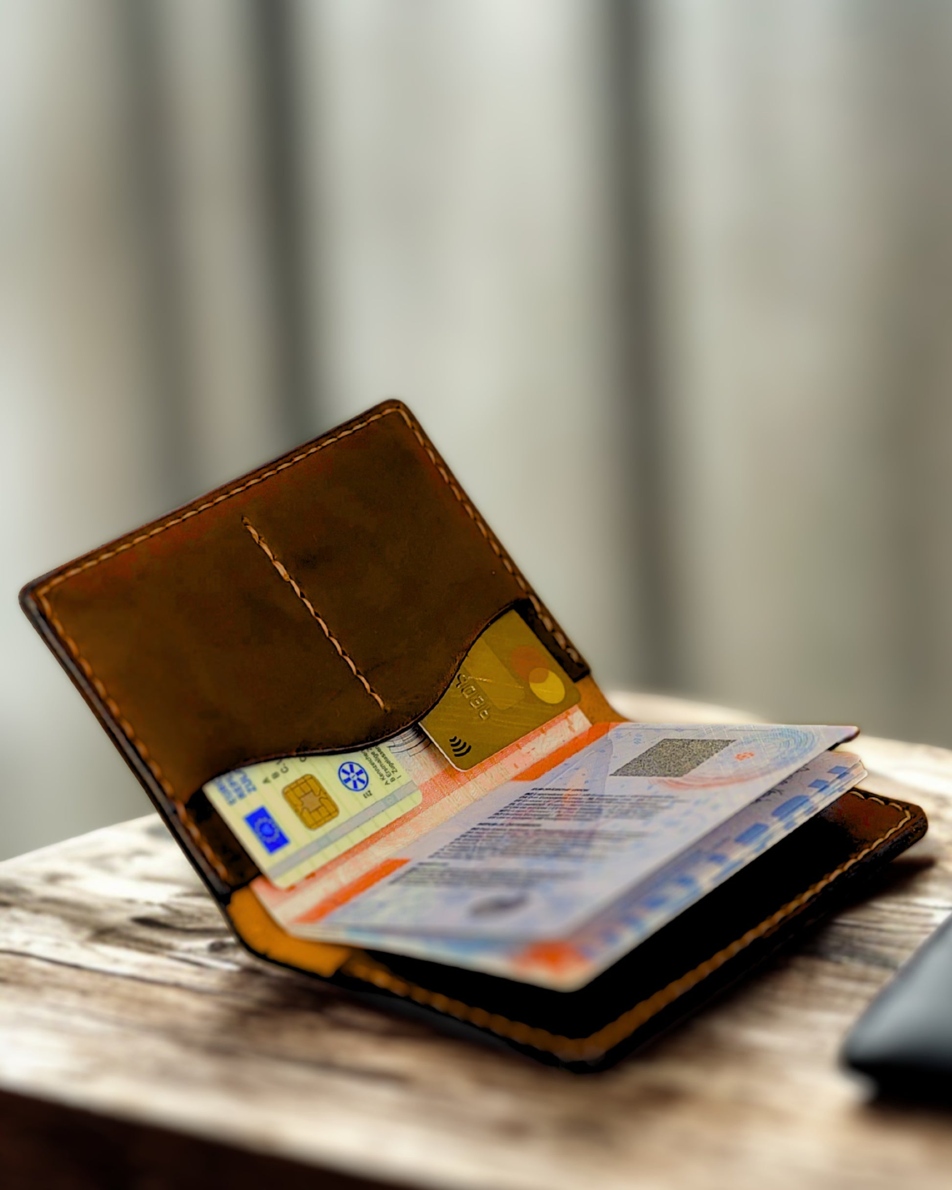 Im Inneren der Hülle befinden sich kleine Fächer, in denen Karten verstaut werden können z. B. Kreditkarte, Führerschein usw. Das Leder ist robust und elegant, gleichzeitig praktisch für die sichere Aufbewahrung von Reisedokumenten.
