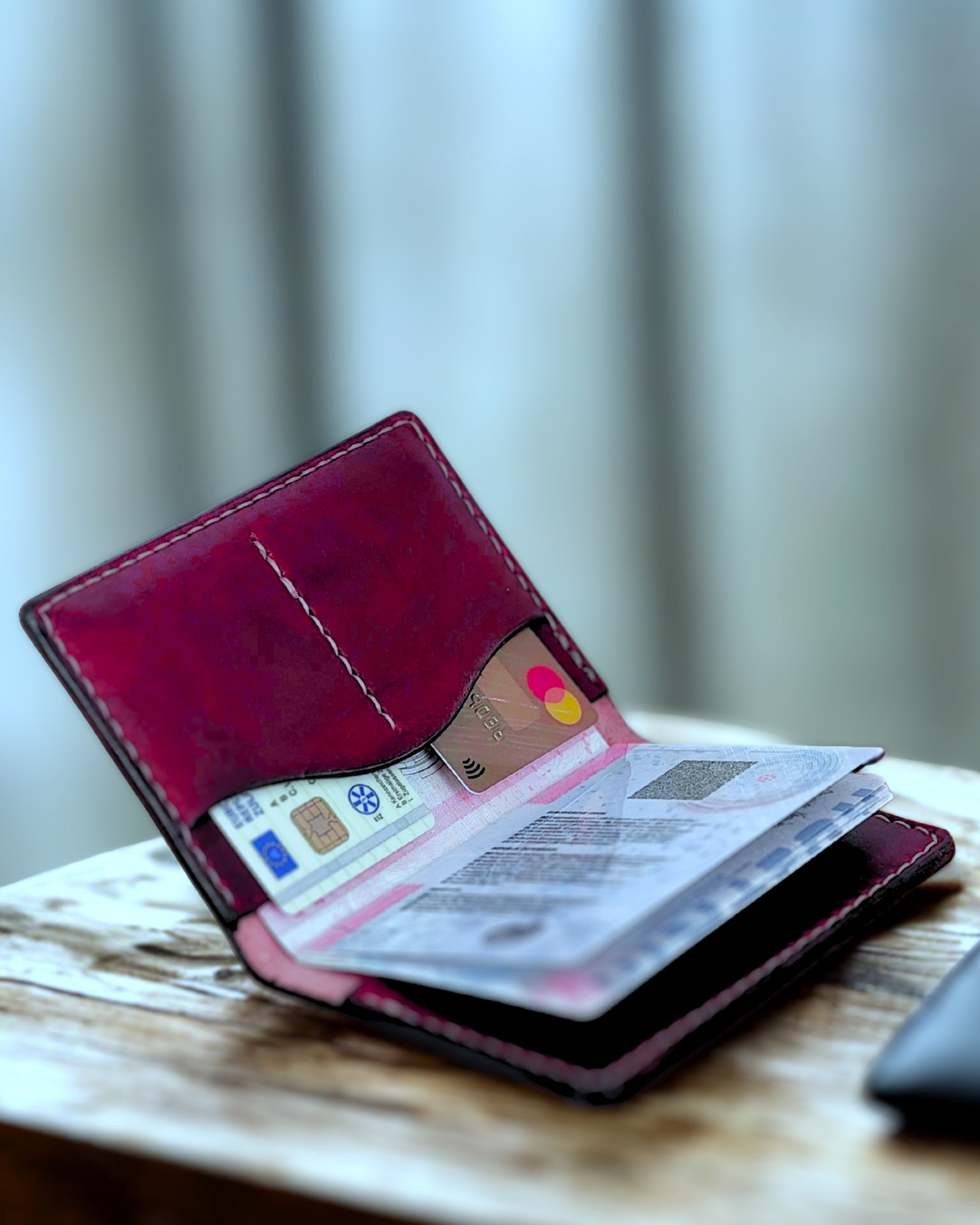 Im Inneren der Hülle befinden sich kleine Fächer, in denen Karten verstaut werden können z. B. Kreditkarte, Führerschein usw. Das Leder ist robust und elegant, gleichzeitig praktisch für die sichere Aufbewahrung von Reisedokumenten.
