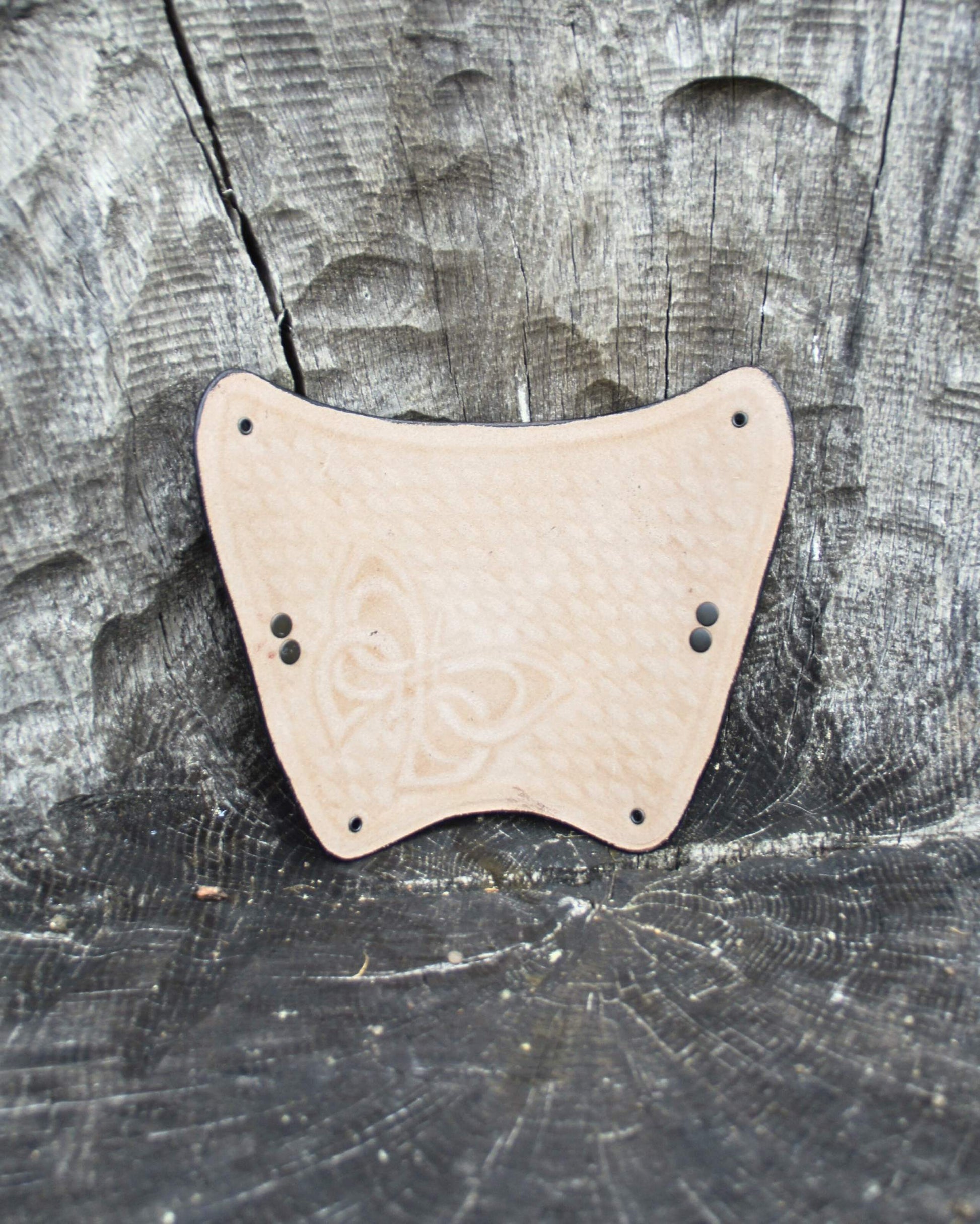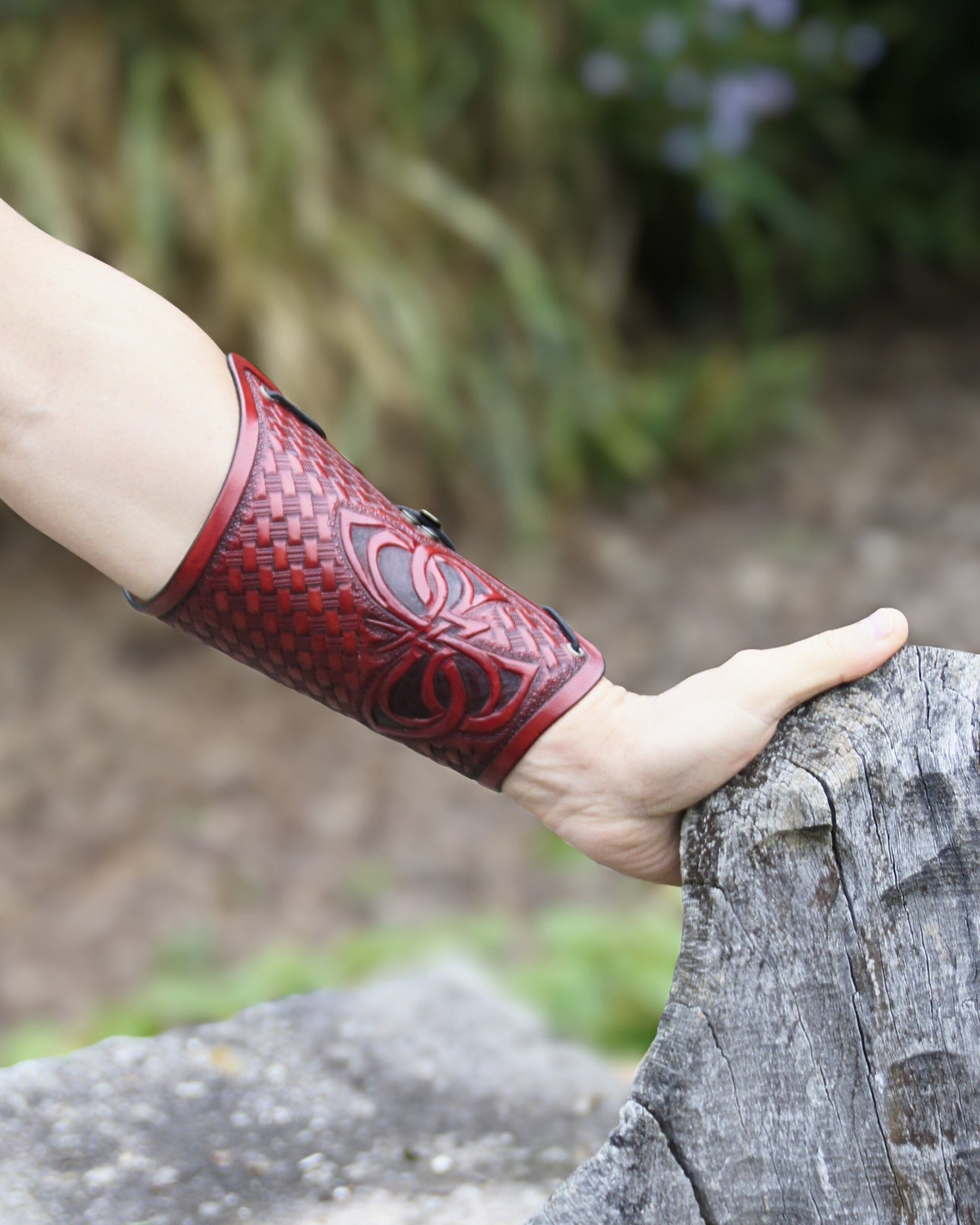 Handgefertigter Leder-Armschutz mit keltischem Schmetterling und Korbflechtmuster