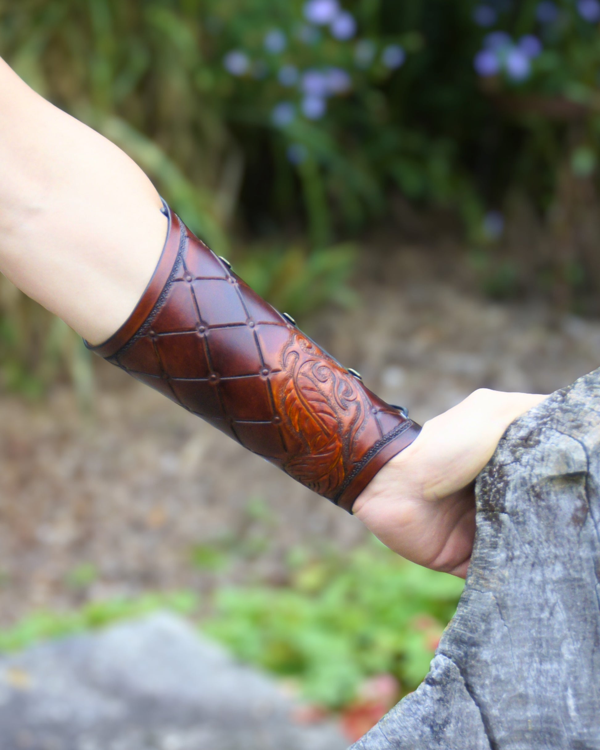 Handgefertigter Leder-Armschutz mit punzierter Feder, ergonomisch und verstellbar
